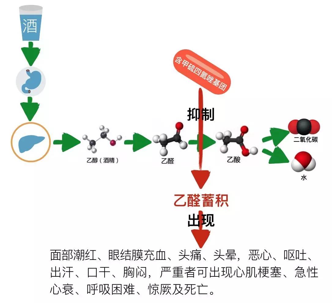 說(shuō)到吃藥+喝酒要人命,大家比較熟悉的是使用************后喝酒要人命的藥源性雙硫侖樣反應!當然不是所有的************都會(huì )引起藥源性雙硫侖樣反應!一般都是含有甲硫四氮唑基團******才會(huì )引起!因其抑制肝臟中的乙醛脫氫酶,導致乙醇的中間代謝產(chǎn)物——乙醛代謝受阻,使血液中乙醛濃度增加而發(fā)生雙硫侖樣反應!